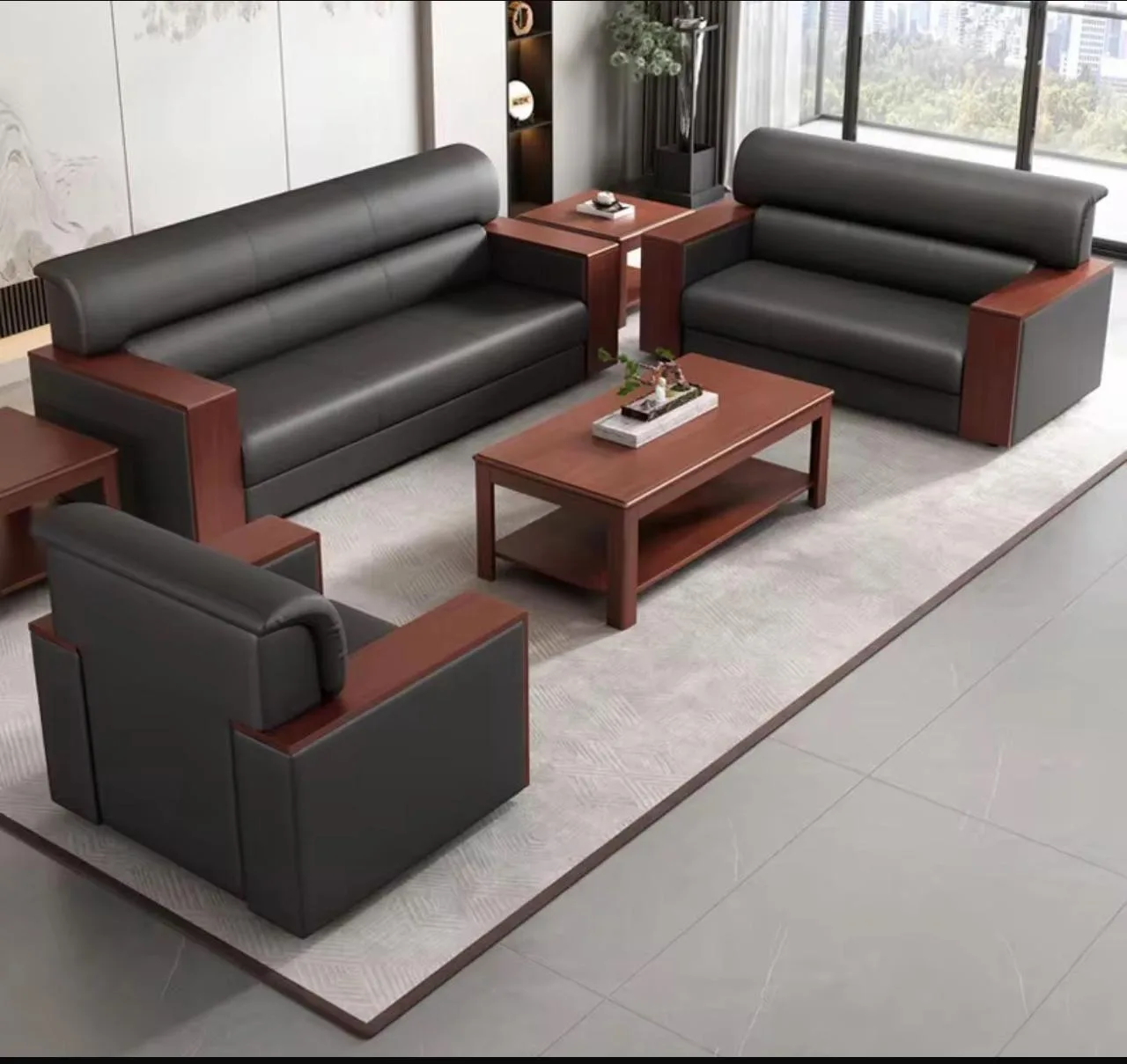Executive Leather Sofa with Wooden Arms 3+1+1